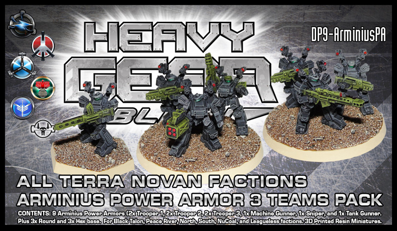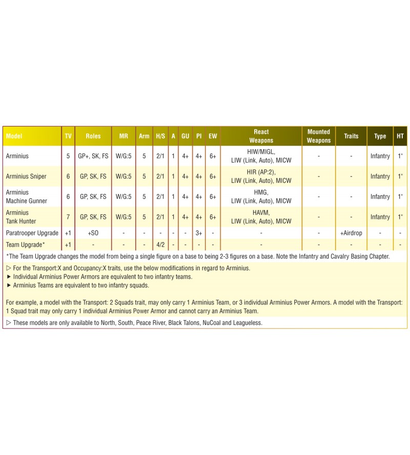 While primarily Black Talon troops, the Arminius Power Armour infantry are also available to the Peace River, North, South, NuCoal, and Leagueless factions. You can represent a typical team with 2 to 3 Power Armour models on a 40mm round base. Alternatively, they can be organised individually on hex bases, and this pack provides three for that purpose. The pack includes three specialist trooper models to represent Machine Gunner, Sniper, and Tank Hunter units.