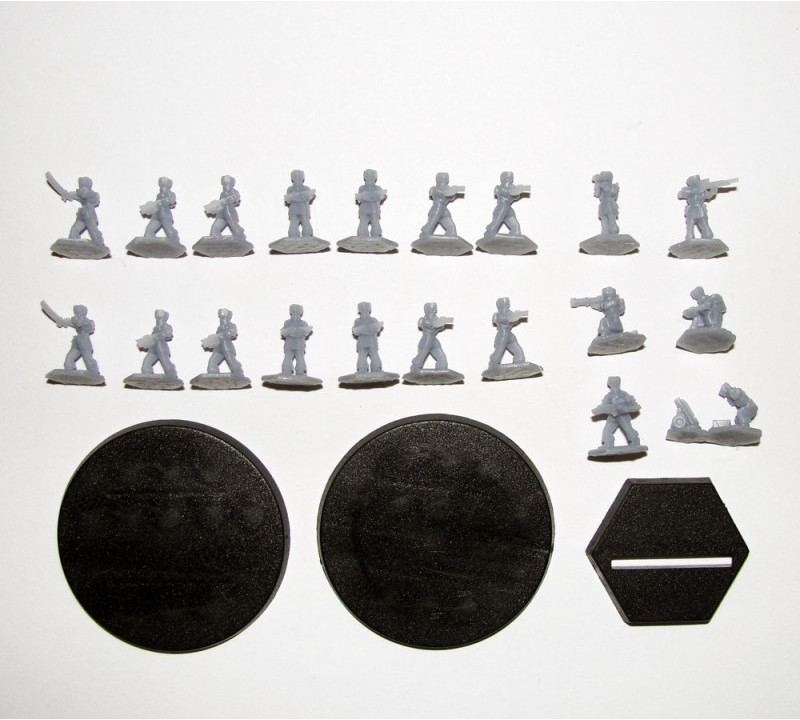 The Eden Infantry (2 Squads & 1 Team) pack includes 20 individual infantry, enough to make 2 squads and 1 team in the current edition’s infantry rules.