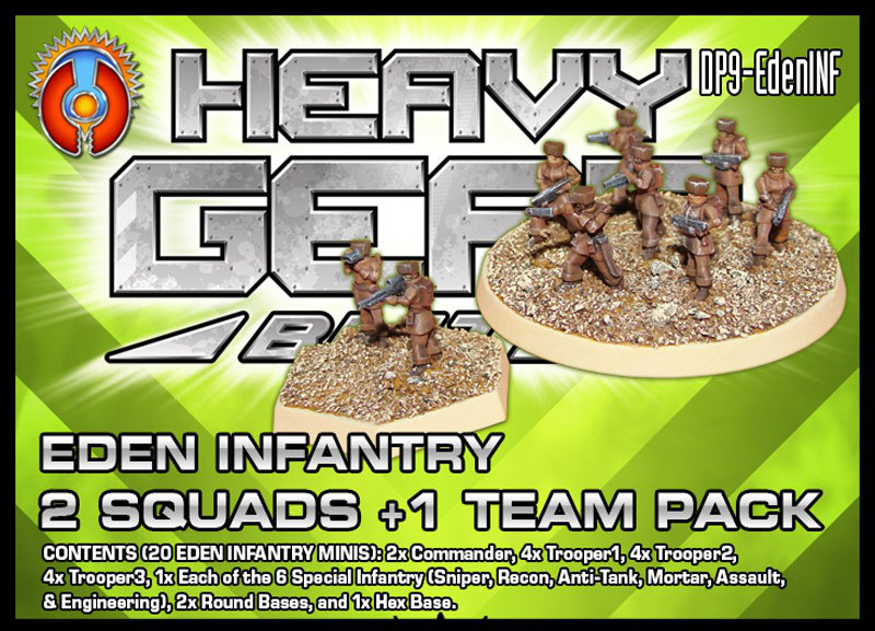 The Eden Infantry (2 Squads & 1 Team) Pack includes infantry models in the uniforms of Eden. You can build a typical Squad represented by 6 to 10 Infantry miniatures on a 40mm round base. Your teams should consist of 2 to 4 Infantry minis on a hex base. This pack therefore allows you to easily create two squads and one team. You can create specialist teams or squads using the six Special Infantry models (Recon, Sniper, Anti-Tank, Assault, Mortar, and Engineering). These units follow all the rules for universal infantry in the Heavy Gear Blitz rules, as the Heavy Gear Blitz 3.1 Companion confirms.