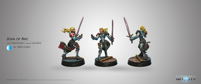 Under the auspices of PanOceania, the “Maid of Orleans” Project aimed to create a military leader capable of inspiring modern troops through the worst of the fight. They needed someone with extreme charisma, someone capable of turning the tide of combat through sheer courage, zeal, and ardor. PanOceania’s analysts decided that troops with a Christian background were likely to respond favorably to such a figure. The Recreation of the Maid was given tactical capabilities far surpassing those of the original, and was subjected to extensive military-religious training inspired by the methods of the PanOceanian Military Orders. Once her training was finalized, she entered the Hospitaller Order, where she was required to persevere in earning the respect of her brothers from the lowest rung of the Order. She was able to rise in rank during the Blizzard Skirmishes against Yu Jing in Svalarheima, and when the NeoColonial Wars broke out, Joan of Arc—already a Sister-Officer of the Knights Hospitaller—was transferred to the Order of Santiago for the defense of the Mars-Saturn circuit. By the end of this tour, the Maid was a living legend, and having served with her was a source of pride across the entirety of the PanOceanian army. She was ordered to oversee the defense of Neoterra to soothe the fears of the masses during the setbacks of the air-space campaign in the Dividing Line. Rumors of her arrival on a frontline are enough to raise the spirits of troops and inspire them to impossible feats. Under her command, soldiers fight to their last breath, with a ferocity, courage and strength unrivalled in any battlefield. Her presence in a fight is seen as an unequivocal sign of imminent victory. Joan has been described as touched by the hand of God: her eyes are burning embers and her voice is a hurricane. She embodies the very concept of an aura of charisma and power. As the mother-warrior of all PanOceanian soldiers, she is admired by all women and beloved by all men.